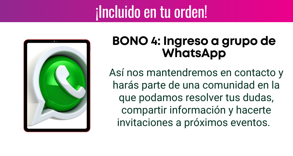 BONO #4: Acceso a grupo de WhatsApp: un apoyo confiable y oportuno con tus dudas.